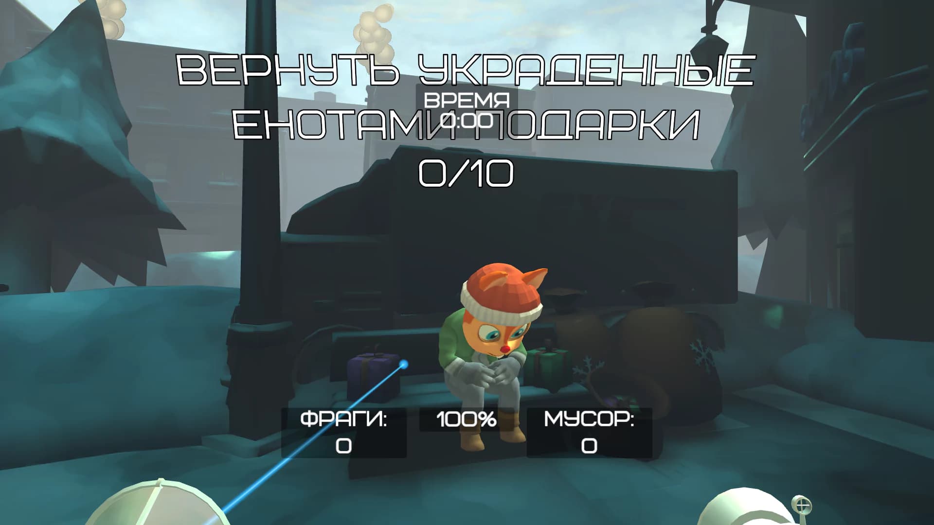 Команда игроков выполняет задания зверят, например, нарядить снеговика, собрать подарки, поймать вырубщика елок. Противники - снеговики и еноты, которые кидают в игроков снежками. Игроки отстреливаются снежками из пушки, из противников выпадают разны
