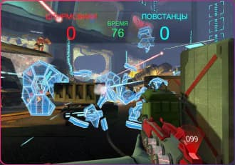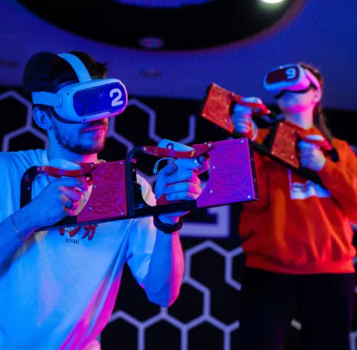 Ничто не сковывает движение игроков, поскольку они используют только беспроводной шлем VR и удобные бластеры нового поколения